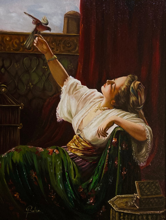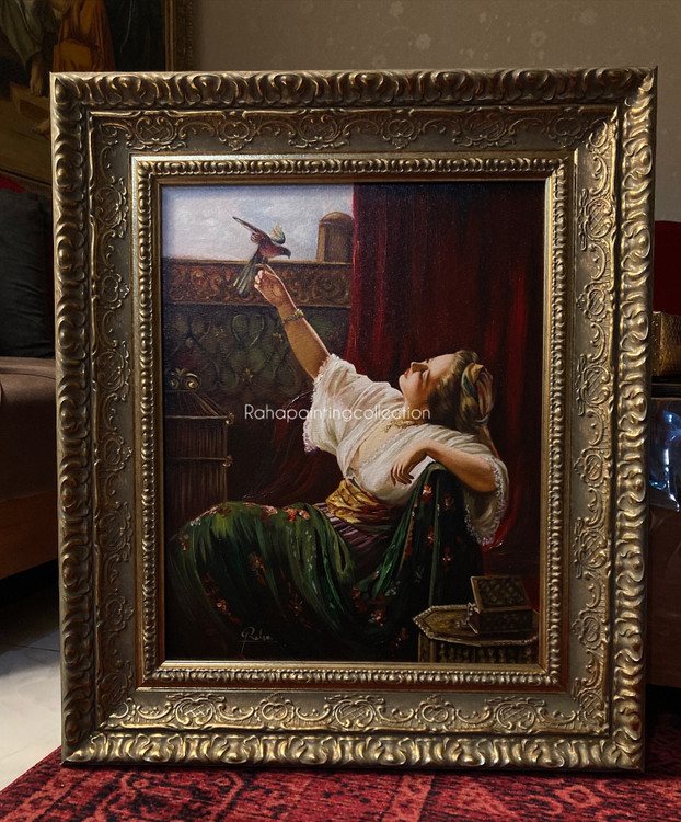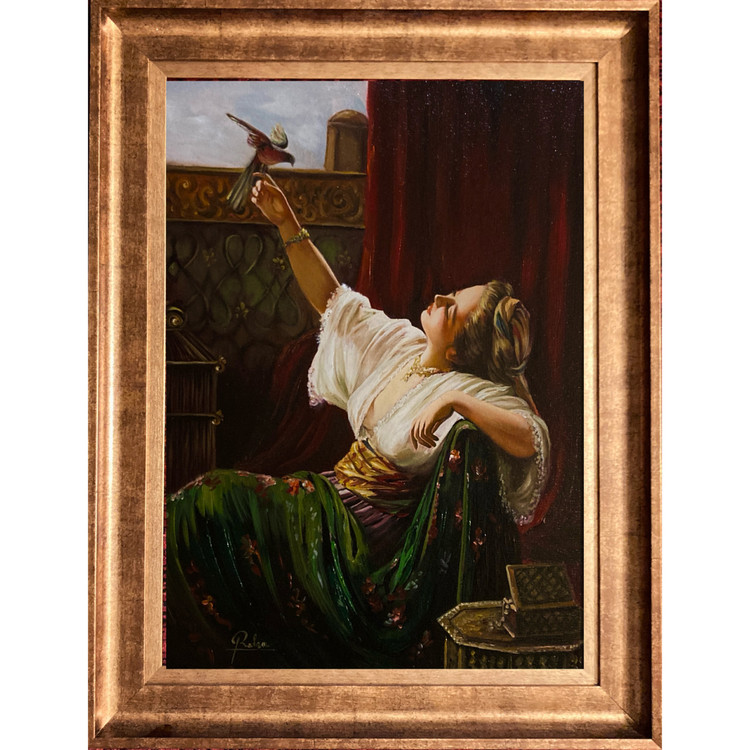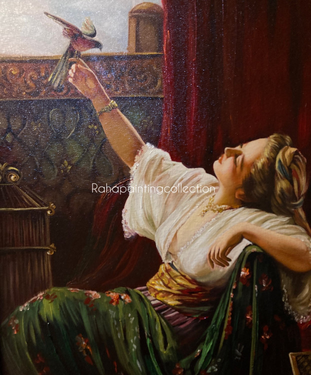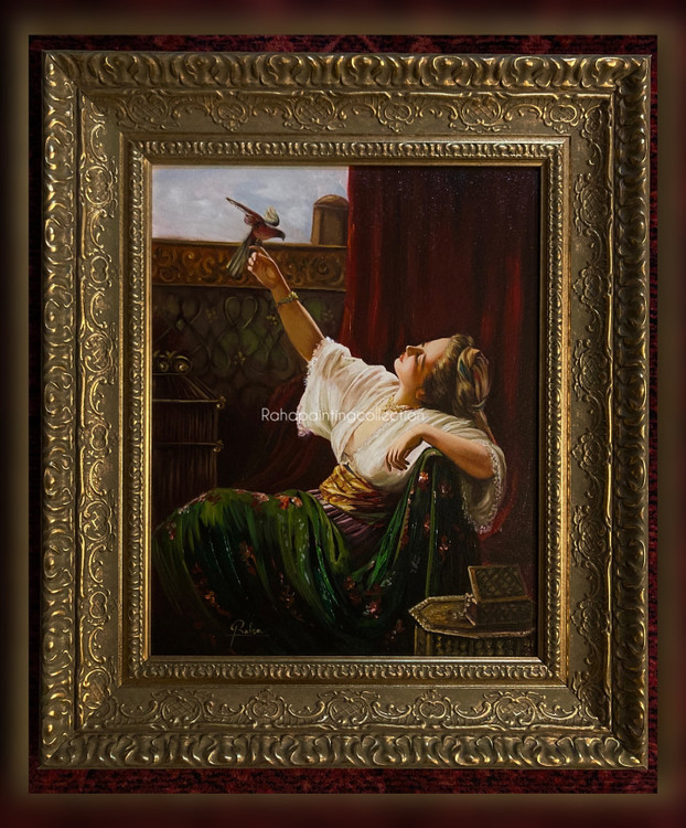 اصل این اثر با نام a beauty holding a bird توسط نقاش فرانسوی بانام (1831-1894) Louis-Emile-Pinel de Grandchamp با تکنیک رنگ روغن روی بوم اجرا شده است.